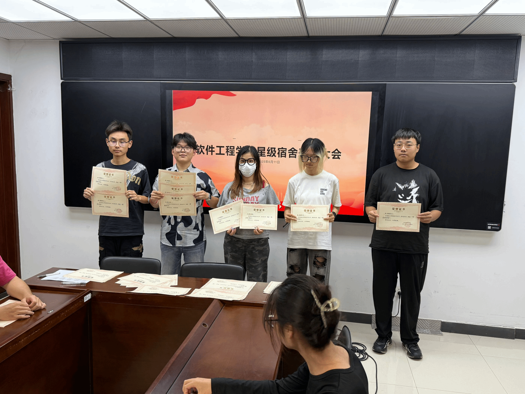2025年6月11日18时30分,软件工程学院在科技楼2-423隆重举行院级星级宿舍表彰会,对在宿舍建设方面表现优异的宿舍进行表彰,受表彰宿舍代表学生齐聚一堂,共同见证这一荣耀时刻。
