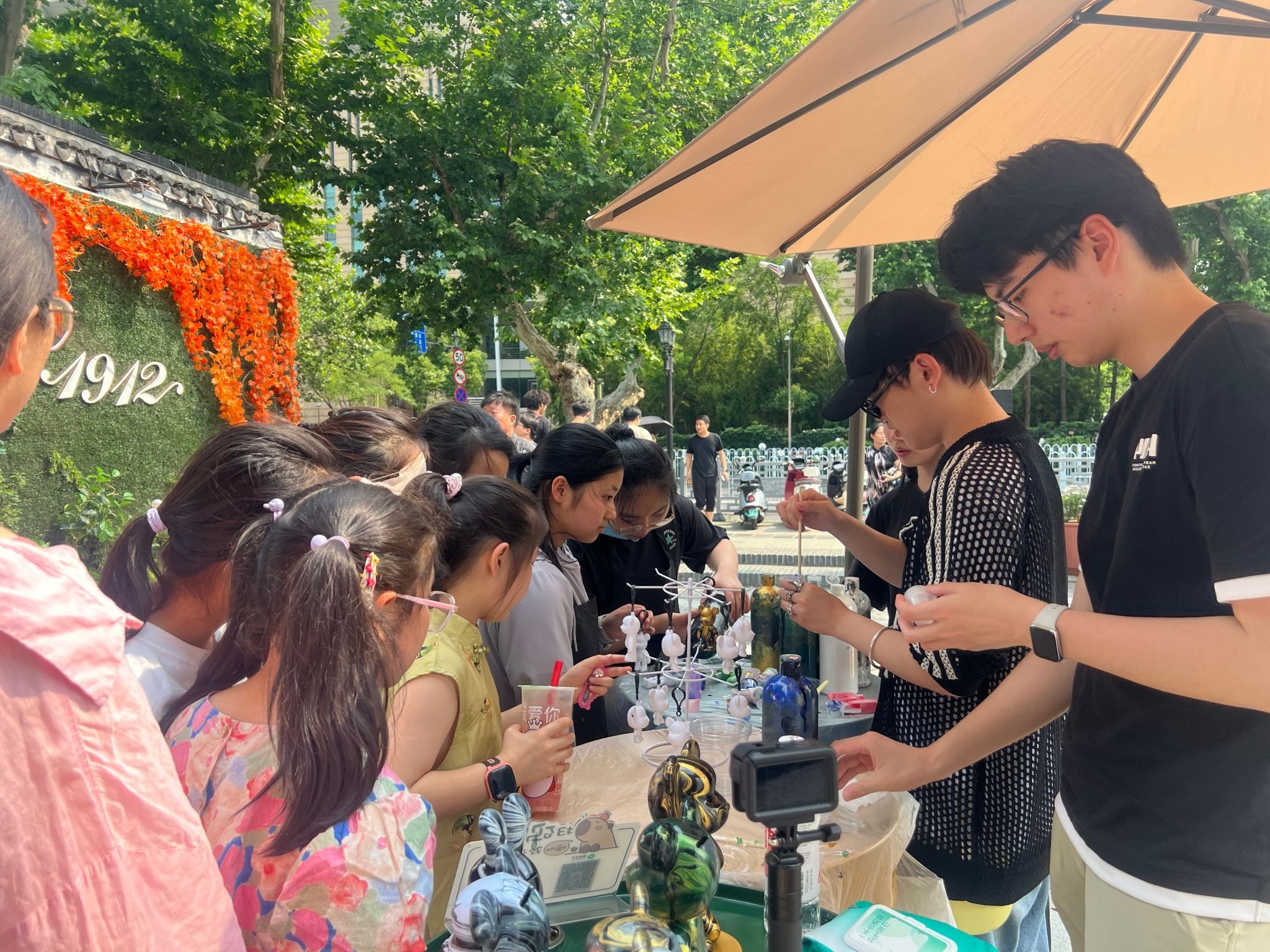 活动现场,14个特色创意小铺的摊主们将课堂知识转化为生活美学。既有“花间指戏”非遗美甲、“荣华录”非遗绒花、“寄忆”非遗螺钿等传统技艺的现代演绎,也包含魔法热缩片、云锦流体熊、毛线针织等潮流手作;从日常饰品到艺术摆件,从实用手作到概念创作,每件作品都凝结着学子对地域文化的独特解读。除了现场的沉浸式体验,活动还创新设置了线上投票评选最佳产品奖环节,吸引超万人参与互动。
