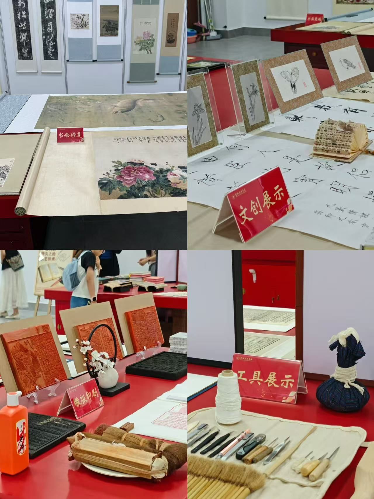 本次展出作品在古典文献学专业教师和原南京博物院文物修复专家共同指导下,主要由古典文献学专业学生完成。展览分为九大板块,分别为古籍修复、书画装裱、书画修复、雕版印刷、档案复制、文创展示、刻本展示、工具展示和修补用纸。“古籍修复”板块展出古籍传统的装帧形制,包括蝴蝶装、包背装、线装、金镶玉装等。“书画修复”板块展出镜片、挂轴等多种形式装裱修复作品,呈现中国传统书画修复中“洗、揭、补、全、裱”技艺体系。档案复制板块展示以《陶渊明诗集》为主的古籍珍本仿真复制技术保护方法。现场还通过视频展示扫描、调色、打印、装帧等仿真复制全过程。