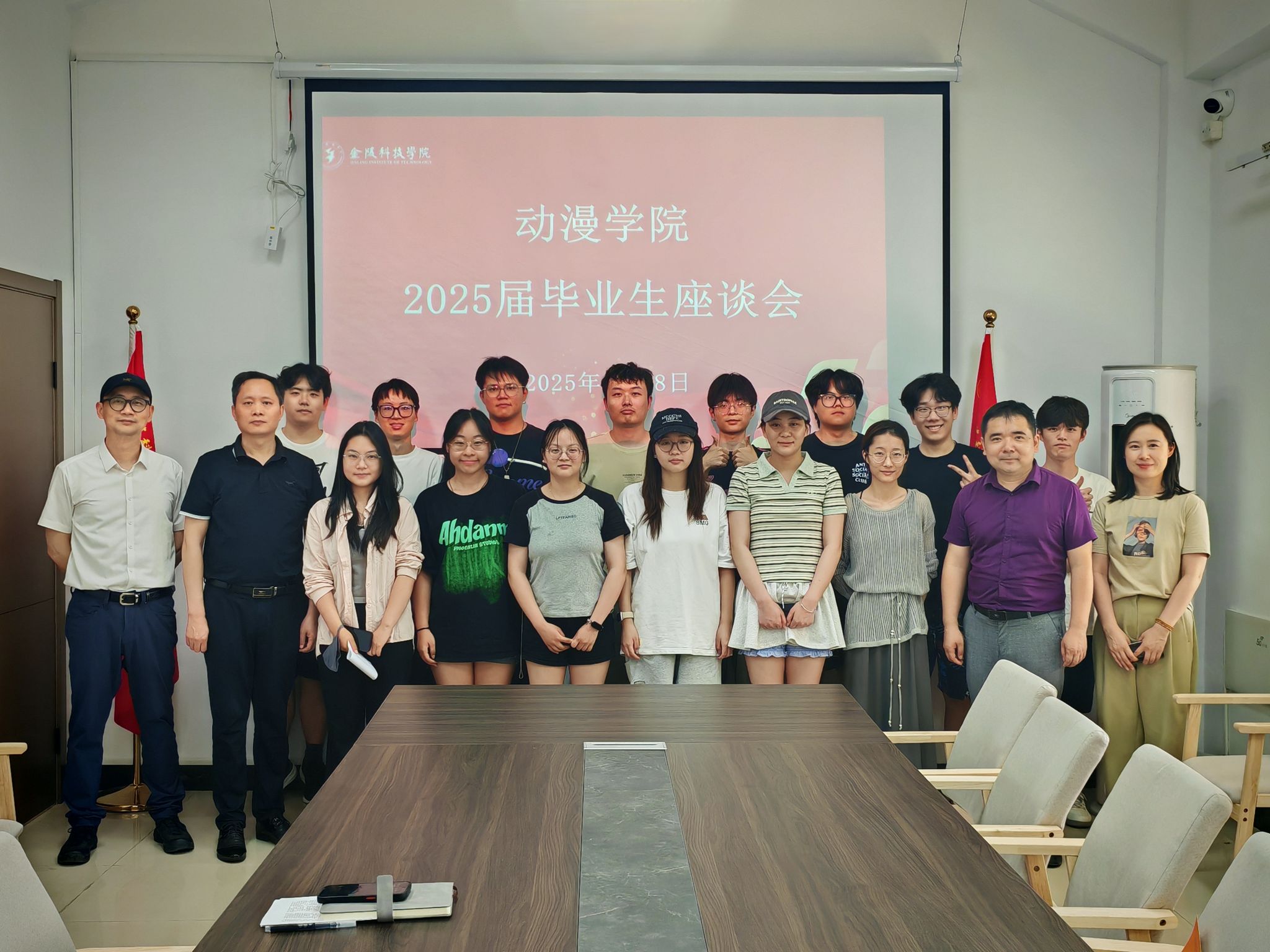 近日,动漫学院在南区02栋“一站式”学生社区举行2025届毕业生座谈会。学院党总支书记葛维东、院长王贤波、副院长王柯及辅导员代表齐聚一堂,与2025届毕业生代表深入交流,倾听他们在校四年的成长感悟与未来规划。