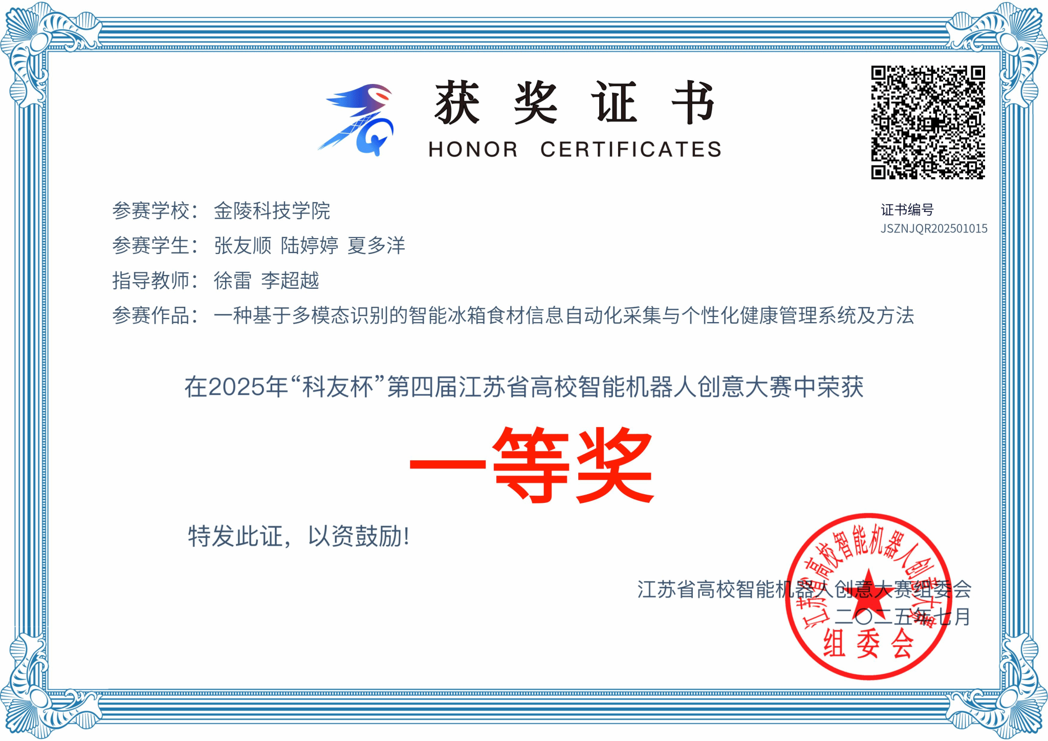 由机电工程学院AI生活“创客”班(凌云科创团队)成员张友顺、夏多洋、陆婷婷三位同学完成的作品《一种基于多模态识别的智能冰箱食材信息自动化采集与个性化健康管理系统及方法》,在徐雷、李超越老师的指导下,凭借其创新性和实用价值,先后荣获江苏赛区一等奖、全国总决赛二等奖。在全国总决赛中,团队与北京航空航天大学、哈尔滨工业大学、南京航空航天大学等752所高校的1492支队伍同台竞技,最终脱颖而出。