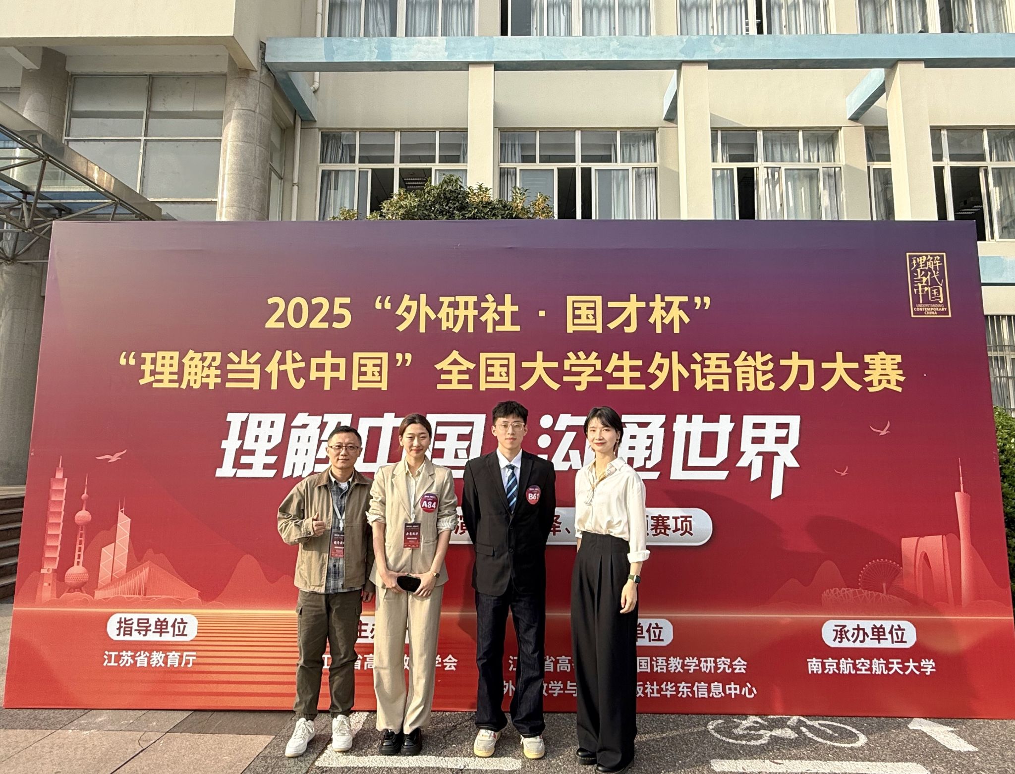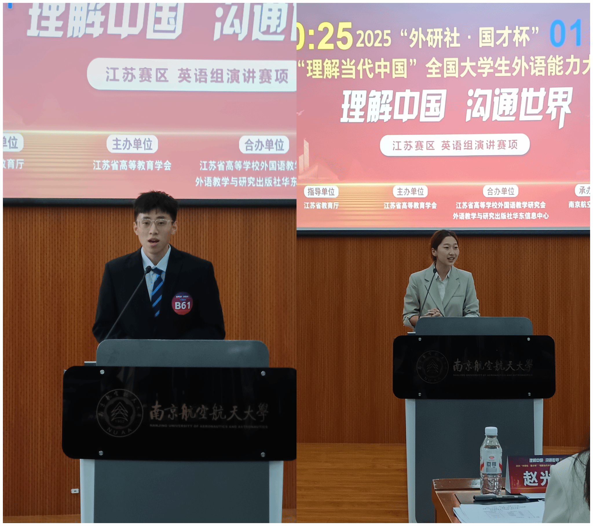 2025“外研社•国才杯”“理解当代中国”全国大学生外语能力大赛英语组演讲省赛于10月31日至11月2日在南京航空航天大学举行。beat365建筑工程学院李子泉同学和人文学院时颖同学凭借优异表现脱颖而出,分获二等奖和三等奖,为学校赢得荣誉。