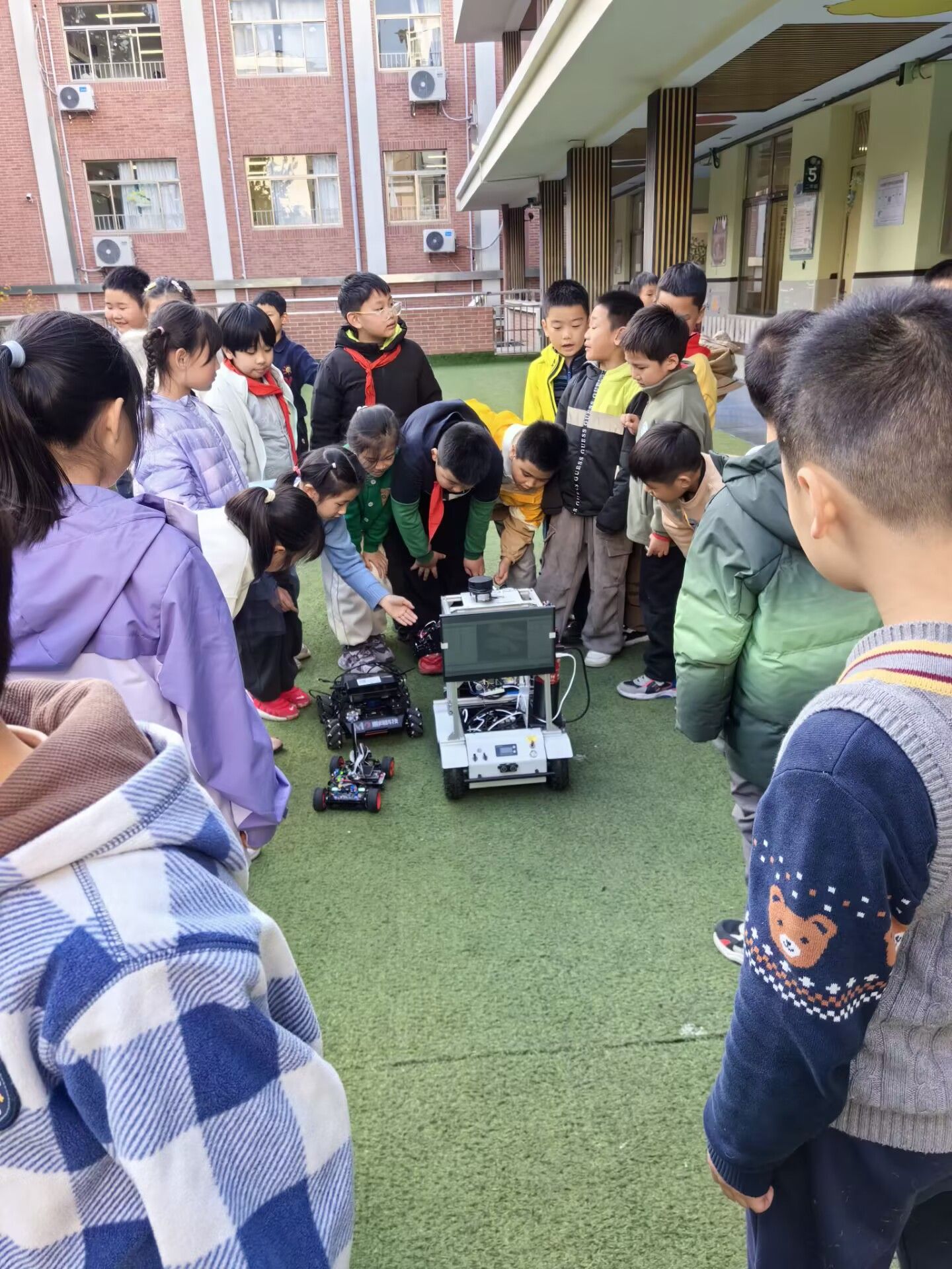 高校智慧“零距离”,王赛雨以生动讲解开启科技之旅,巧用马达小船、球形齿轮、机械臂、篮球机器人等趣味科技模型导入主题,用直观可见的动态演示拆解机械原理,将抽象科技知识转化为鲜活场景,快速吸引学生注意力,激发探索兴趣。随后,消防巡检机器人、竞速机器人、智能侦察机器人车依次亮相,通过模拟实操、互动体验展现科技魅力,团队成员精心指导学生调试指令、操作运行,在沉浸式体验中传递科创理念。现场学生踊跃提问、积极参与,在欢声笑语中触摸科技、萌发创新意识。我院“行走的科创课堂”将前沿科技转化为孩子们看得见、摸得着的互动体验,架起课本知识与现实应用的桥梁,让科学思维的种子在孩子们心中“生根发芽”。