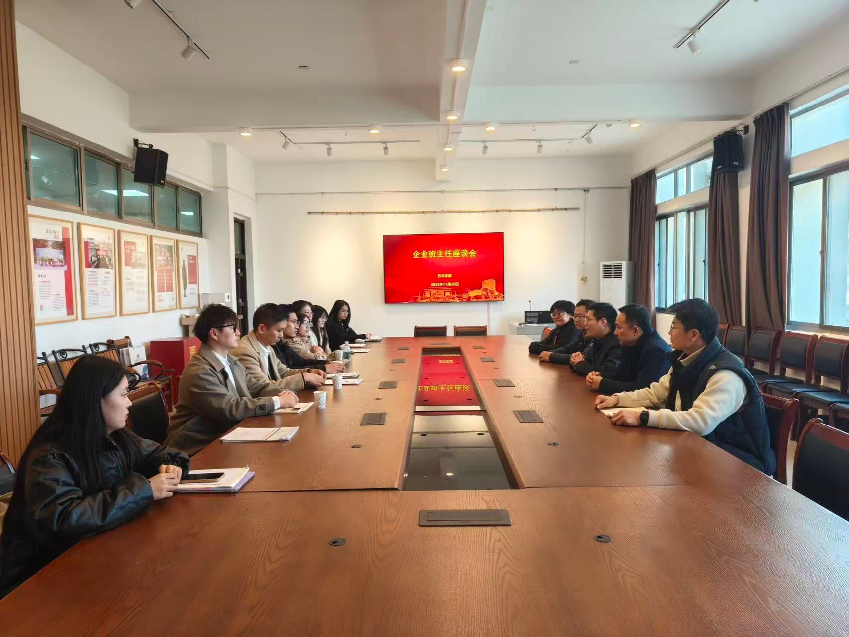 11月26日下午,艺术学院在问学楼6306会议室召开企业班主任交流座谈会。学院党委书记、院长匡才远,党委副书记鲍锐,学工办主任丛扬子,环境设计系副主任赵子君,产品设计系副主任樊文育出席会议;南京迪默塔数字科技有限公司总经理蒋广登、南京双喜云锦织造有限公司总经理陈林、江苏意趣数字科技有限公司总经理周炎、上海新游灵溪教育科技有限公司市场主管李洋4位企业班主任及学生代表共同参会。
