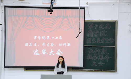 6月11日,经报请校团委同意,商学院在7100教室召开第十七届团总支、学生会、社科联换届选举大会。参加此次会议的有商学院党总支副书记朱骅,团总支副书记、学工办副主任彭小智,学工办负责团学日常工作的辅导员印鹏,辅导员申瑞、沈慧慧、顾磊、徐淑娟、马丽芳、沈皆希、黄丹丽、徐冰洁,第十六届团总支、学生会、社科联学生骨干,15、16、17级各班团员和学生代表。商学院团总支副书记胡涵彧同学主持大会。