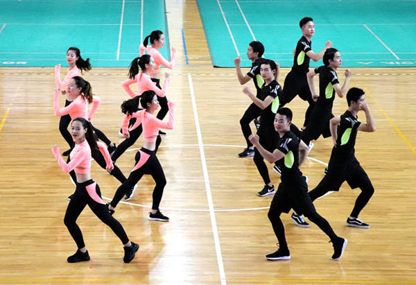 赛场上,身着亮丽参赛服的人文学院啦啦操用轻快的步伐跑进舞台,现场观众眼前一亮,她们脸上洋溢着笑容,动作整齐有力,用身姿诠释着青春的奔放,用热情编织青春的浪漫。挺拔婀娜的身姿、熟练轻盈的动作与音乐融为一体,完美诠释了啦啦操的激情与柔美。在健美操比赛中,队员们充分展现了长久以来形成的默契,动作衔接完美无瑕,以他们的热情、自信、微笑点燃了现场,六名男队员的表现更是不负众望,不仅完成了高难度的托举动作,而且有韵律的动作,更是获得了评委老师的青睐。
