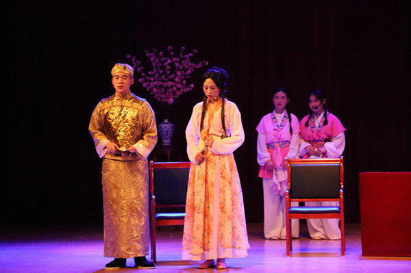 杨文聪的饰演者来自17秘书学(2)班褚杨波同学,其字正腔圆,抑扬顿挫和恰到好处的情绪表现,将剧中杨老爷亦正亦邪的人物形象展现的淋漓尽致。大幕拉下,表演结束,全场观众久久不愿离去,仍沉浸演员们惟妙惟肖的表演中。