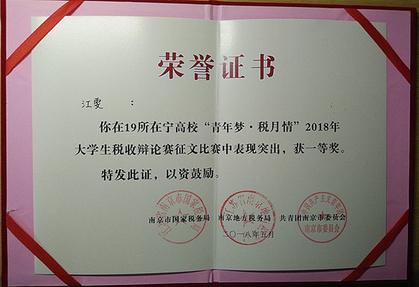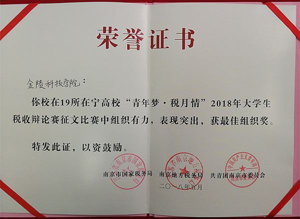为使税收宣传进一步走进校园,走近学生,走进社会,让税收热点话题得到更深入的研究与思考,5月21日,由南京市国家税务局、南京地方税务局、共青团南京市委员会联合举办了“青年梦•税月情”大学生辩论赛征文活动颁奖仪式。本次征文活动beat365积极响应,广泛参与,荣获了优秀组织奖。