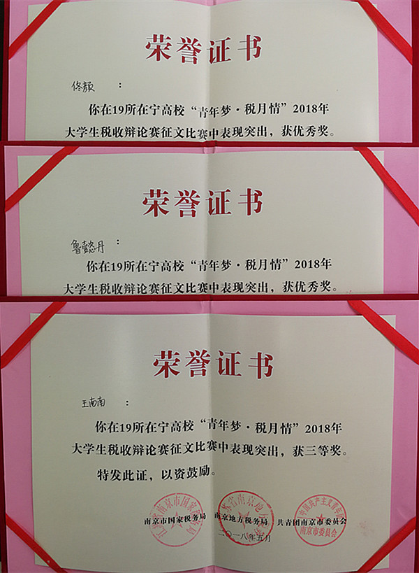 我院15行政管理(行政法)班江雯同学,在此次征文比赛中,以《加大科技型中小企业税收优惠对科技创新的影响》荣获一等奖,17秘书(1)班王南南以《论优化税收营商环境重在税务机关纳税服务还是重在提升纳税人的自主办税能力》荣获三等奖,16旅游管理(1)班佟颜《加大科技型中小企业税收优惠力度对科技创新有显著作用》、15古典文献(古籍修复)班鲁懿丹《优化税收营商环境重在税务机关的纳税服务》荣获优秀奖。(审稿人:高欢欢)