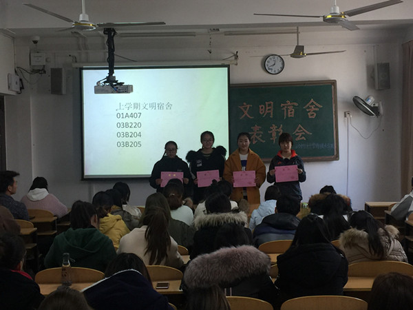 此次表彰会主要表彰2017-2018学年第一学期获得“文明宿舍”称号的宿舍集体。表彰会上周秀丽老师对上学期我院在学生宿舍卫生、宿舍文化建设方面所取得的成绩和存在的缺点进行了总结,强调了宿舍卫生的重要性,进一步向学生阐释宿舍的规章制度及文明宿舍的评选标准,鼓励学生们参与到文明宿舍建设的活动中来。