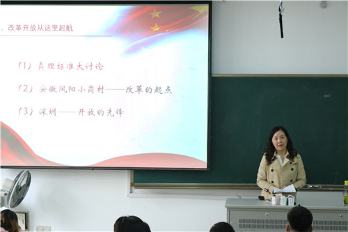 尹剑老师从改革是决定当代中国命运的关键选择和将改革进行到底两个方面阐述了改革开放四十年的历程。首先从真理标准大讨论、安徽凤阳小岗村的改革、深圳改革开放后的巨变等历史事件娓娓道来,解释了改革的起点;随后通过图片、视频、沙画等多媒体手段展示了改革开放40年的历史巨变,分析了改革开放40年历程的不同阶段,并从经济、民主政治、文化、社会、生态文明、国际影响力等方面的变化阐释了改革是决定当代中国命运的关键选择,是发展中国特色社会主义、实现中华民族伟大复兴的必由之路。