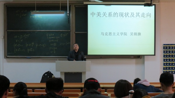 讲座伊始,吴教授简明扼要地说明了此次讲座的目的以及主要内容,然后分“从1784年到现在”和“从早期的民间经贸往来到现在的大国博弈”两部分为同学们细致地阐述中美在历史上的外交关系。此次讲座内容丰富多彩,同学们聚精会神的听老师的生动形象、风趣幽默的演讲,也了解到了很多有关历史及国家外交的知识。