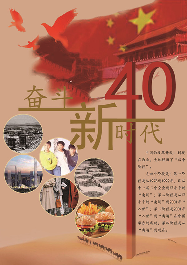 “改革的春风吹起,时代经过了一番新的洗礼”,在主持人清晰嘹亮的介绍声中,十组选手陆续登台,向大家展示自己的海报作品,围绕主题从设计灵感、理念和色彩等方面向观众详细讲解了海报内涵。观众们跟随讲解,聆听了他们对时代景象的描绘,好似进行了一场时光之旅,纷纷感慨改革开放40年来祖国的伟大变化。经过所有选手的激烈比拼,大家一致认为王奕辉、钱晨欢、潘文慧组成的小组完成的作品,主题突出,简洁大气,最终荣获一等奖。