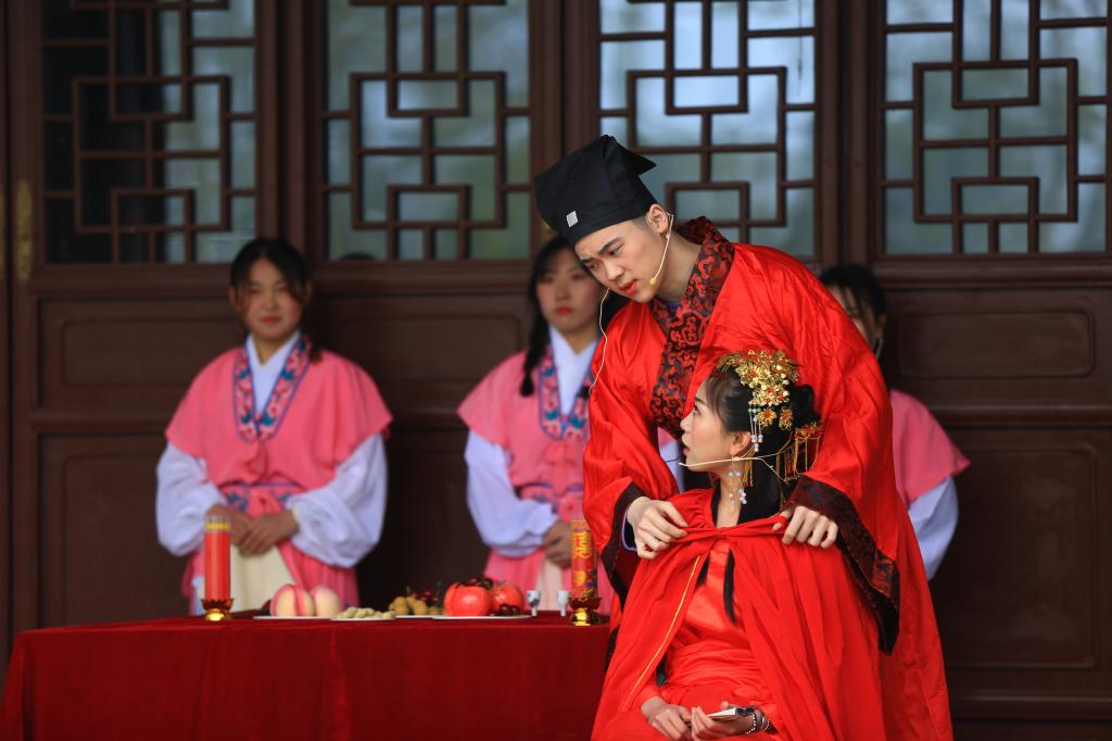 在栖霞寺广场的长廊下,一大早剧社的老师和同学们早已做好准备,为前来踏春的游客演绎“桃花”故事与传奇。该剧曾在2016年首届“山·寺·桃花”会上上演,时隔三年,又融入了“栖霞山”、“栖霞寺”的元素,演员们在舞台上惟妙惟肖地演出,将话剧人物形象表现的淋漓尽致,赢得了现场观众阵阵掌声。当天有两百多人次,在观众席观看了演出。