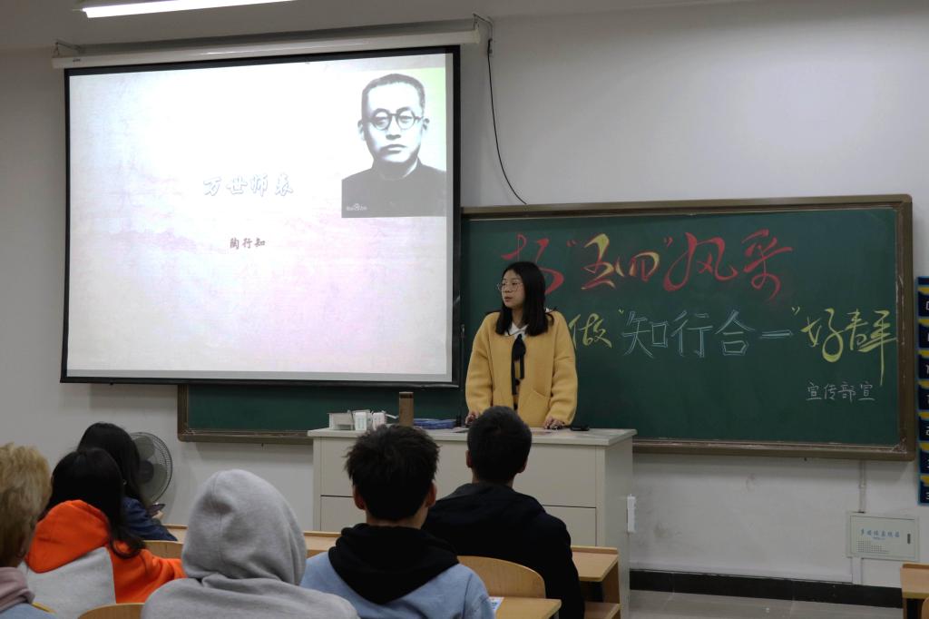 活动伊始,各班的发言人精心制作了PPT,展示了教育家陶行知先生一生的光辉事迹。18级秘书(2)班的团支书王卓凡,向同学们讲述了陶先生的教育理念,使大家深入学习了“教学做合一”的理念;18旅游管理班团支部,通过集体朗读陶先生的文章《自勉并勉同志》来向其致以崇高的敬意;18数字出版(2)班团支部,通过播放陶行知先生纪录片《先生》,来再现“身体力行”教育思想。活动中同学们也分别分享了感悟和解读,来自18行政管理(2)班的赵宇桐说到“一个时代的精神是青年代表的精神,而我们这一代青年是有理想、有担当的。”