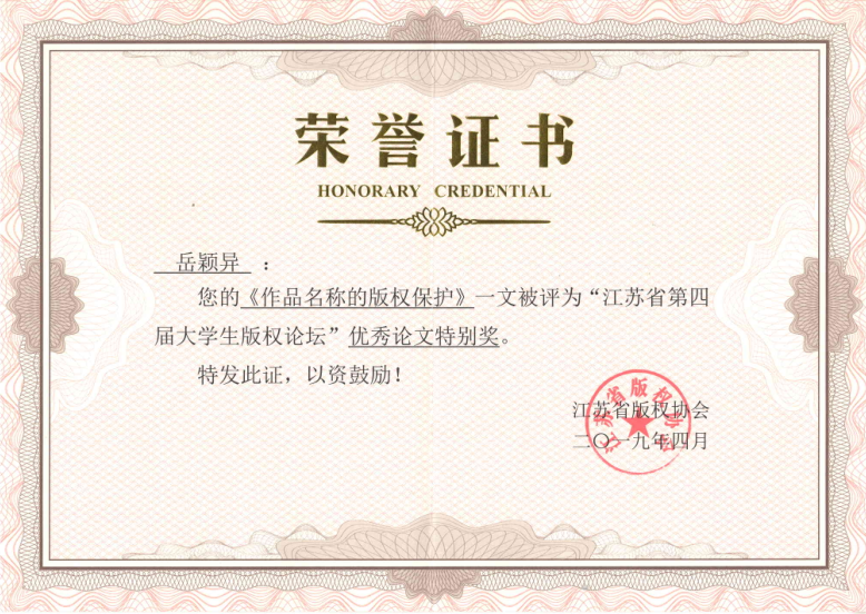 2018年,江苏省版权协会以新时代发展为主题,聚焦新媒体面对的版权热点问题,成功举办了江苏省大学生版权征文评选活动和“江苏省第四届大学生版权”。征文工作组委会收到来自江苏省和江苏籍大学生关于版权的论文三百余篇。经过专家初审、答辩复评和模拟演讲等程序,评定20篇论文入围,并推选其中8篇为江苏省第四届大学生版权论坛演讲论文。我院16级行政管理专业学生岳颖异成功入围。2018年10月21日,岳颖异同学在苏州国际博览中心演讲了她的论文《作品名称的版权保护》,展现了人文学子自主学习、刻苦钻研的精神风貌,取得了“优秀论文特别奖”的好成绩。因beat365在该活动中成绩图书,被予以了“最佳组织奖”的表彰。