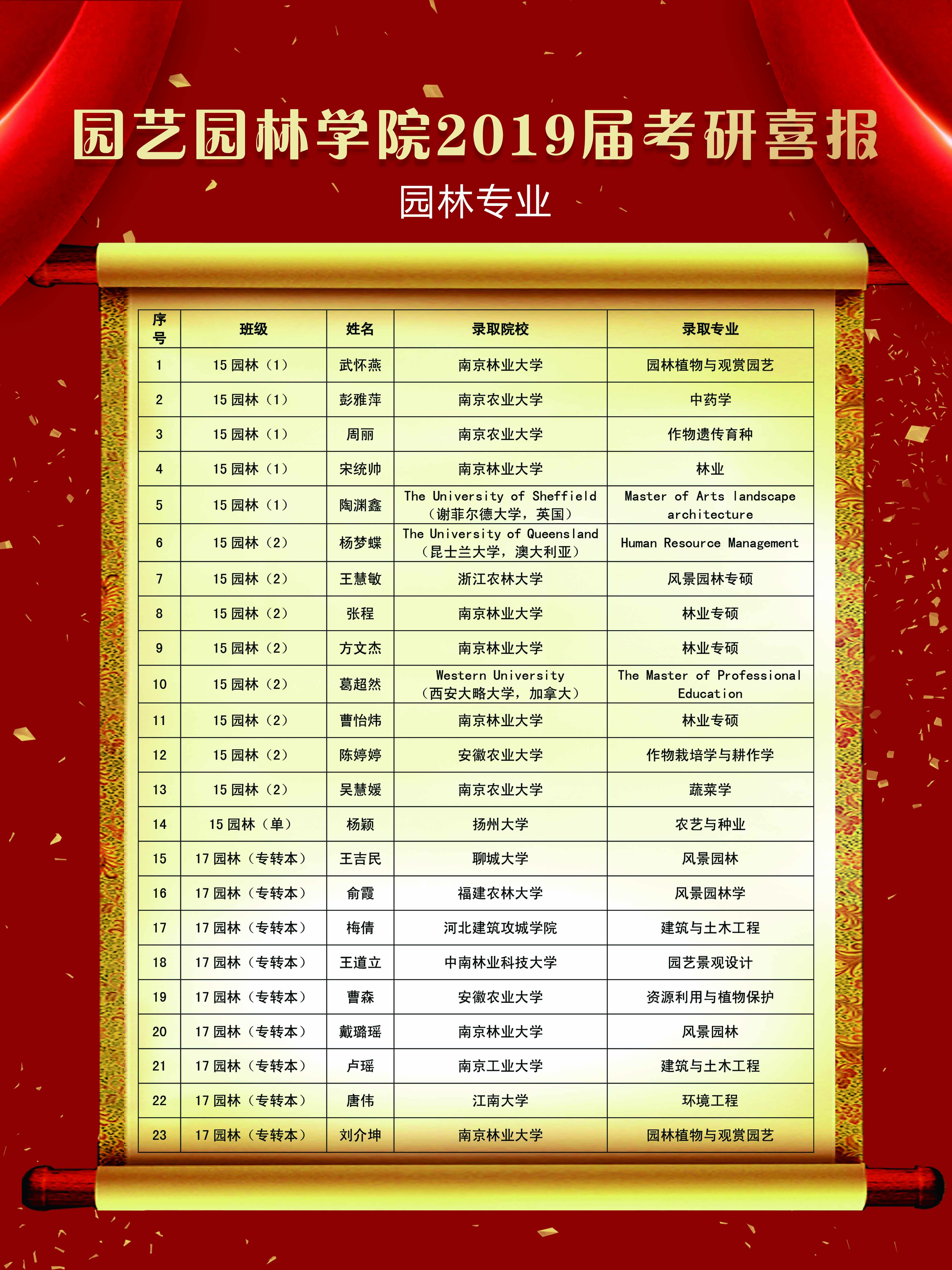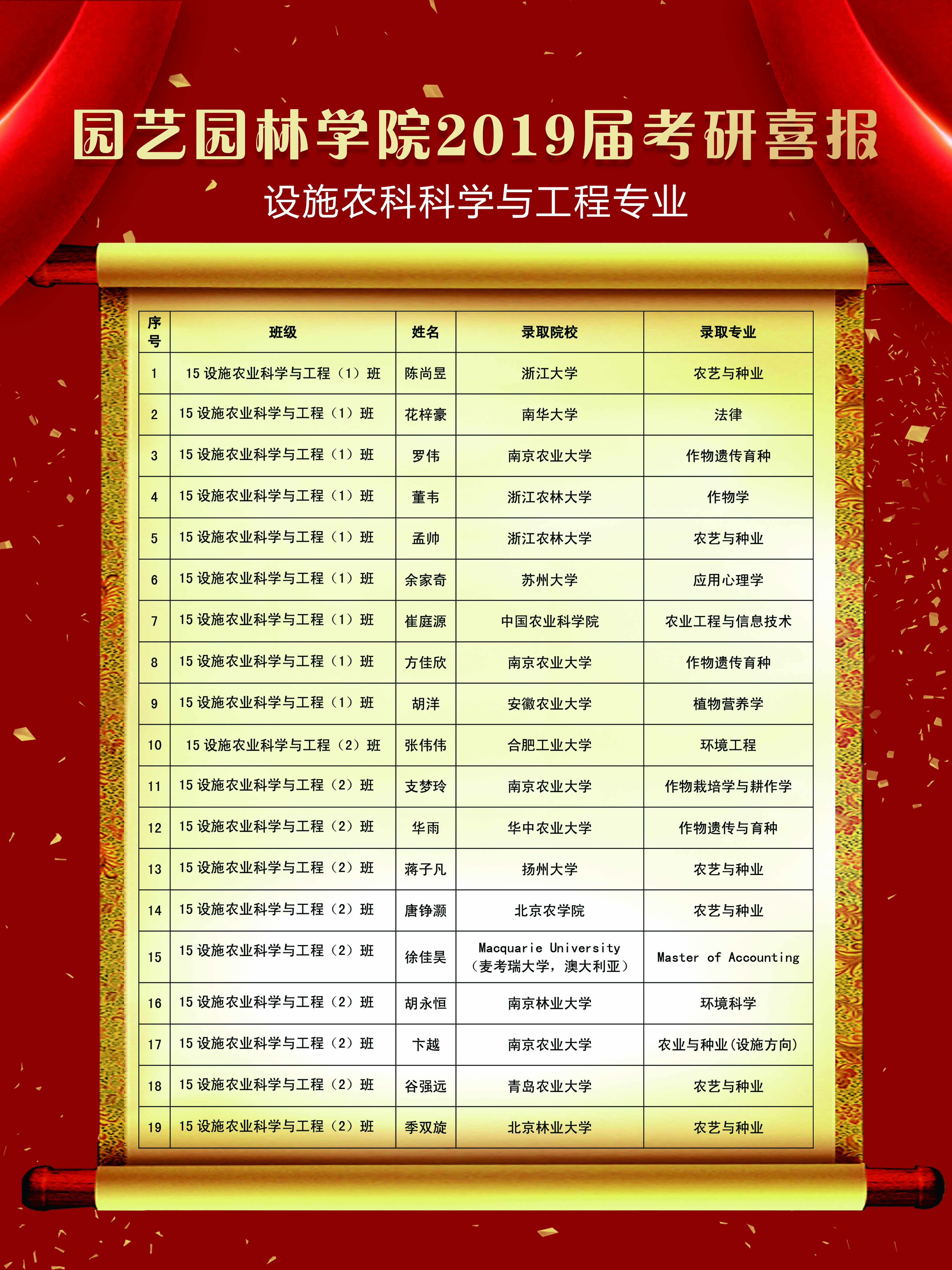 2019届考研结果尘埃落定,我院考研学子喜讯频传,考研录取人数再创新高,共有60名学生考取硕士研究生。5月22日下午,园艺园林学院在图教楼B205隆重举办2019届考研表彰大会。院党委书记陈玉林,院党委副书记、院长宰学明,教师代表王长义,学工办甘黎明、徐敏、王淼老师,2019届考研录取学生,以及2016级、2017级、2018级学生代表近200人参加本次大会,会议由卞长林老师主持。