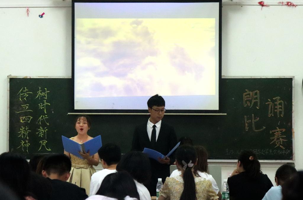 比赛正式开始前,主持人带领大家一起主持人带领大家回顾了五四运动爆发的历史背景、发展经过、历史意义,重温了100年前那段激情燃烧的岁月。比赛正式开始,九组参赛选手以饱满的热情、激昂的语言和大方得体的演讲,把对党和国家的款款深情表达地淋漓尽致。来自18旅游管理(单招)班的王蕾同学,在她的演讲中说:“我们接过历史的接力棒,需以青春之我、奋斗之我建功立业,中华民族伟大复兴的中国梦终将成为现实!”充分展现了当代青年蓬勃昂扬的朝气和勇于拼搏的决心。经过激烈的角逐,范育明和张煜小组凭借《我的祖国》,以铿锵有力、从容自信的演讲斩获一等奖。