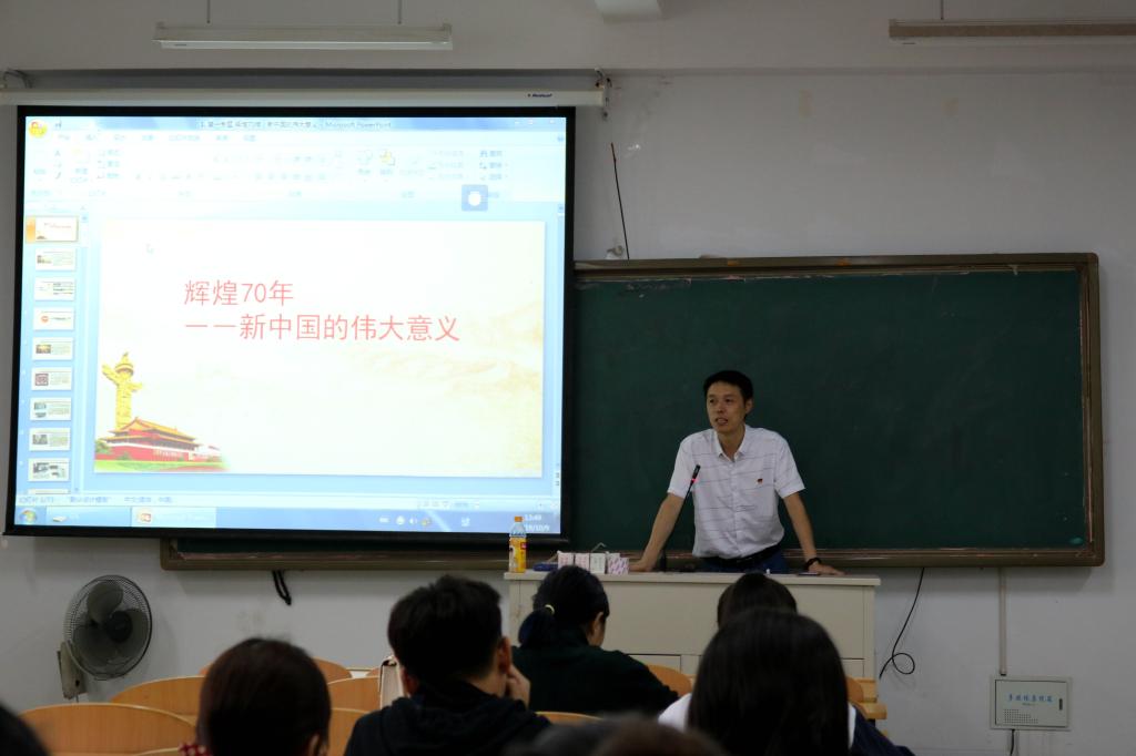 讲座伊始,周老师从此次新中国成立70周年国庆阅兵仪式谈起,向同学们阐述了新中国成立的伟大意义。他通过改革开放等一系列历史大事件,介绍了新时代中国特色社会主义制度的优越性和新时代中国在政治、经济、文化方面取得的巨大成就。最后,结合大学生学习生活实际,周老师希望大家找准自己的发展目标,定位自己的发展方向,为中华民族伟大复兴的中国梦而不懈奋斗。