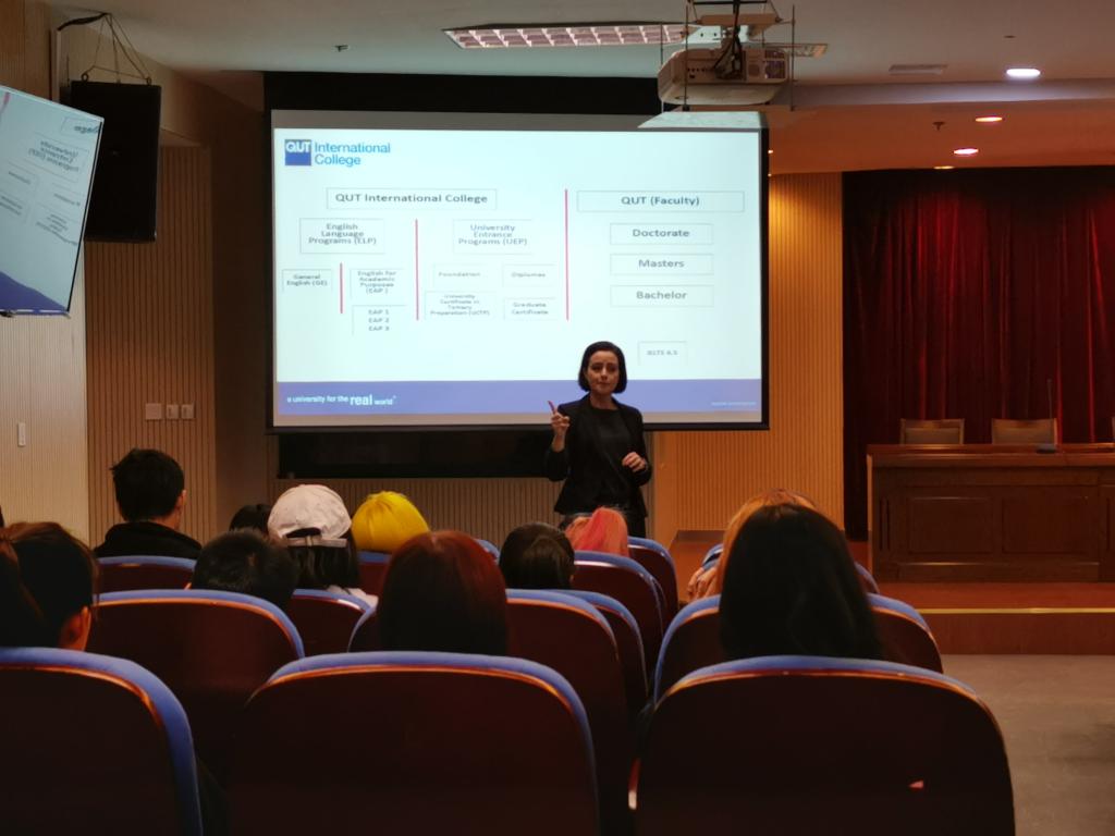 明年即将进行跨境教育第二阶段学习的G17软件工程和H18会计学认真听取了Johanna Clancy女士精心准备的为期两天的精彩示范教学。同时,由于昆士兰科技大学的EAP课程设置与入学要求将于2020年开始执行新的方案,Johanna Clancy女士经过精心准备,向17、18、19级软件工程专业及会计专业的学生进行了专题讲座。讲座中,她从EAP课程的授课形式、授课内容、QUT国际学院的整体情况、海外学生在QUT的学习和生活等方面进行了介绍和讲解。讲座结束后,她还亲切解答了项目学生对留学后专业学习及生活提出若干问题,增强了中外合作办学项目学第二阶段选择跨境教育的信心。