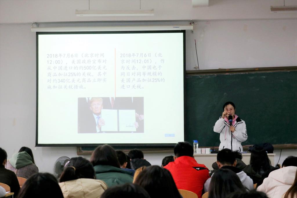 为使同学们更好地认识和把握当今世界的形势与政策, 12月18日下午1:30,我院邀请马克思学院潘赐璇老师在图教楼201,开展了以“揭示中美贸易战问题”为主题的形势与政策讲座。