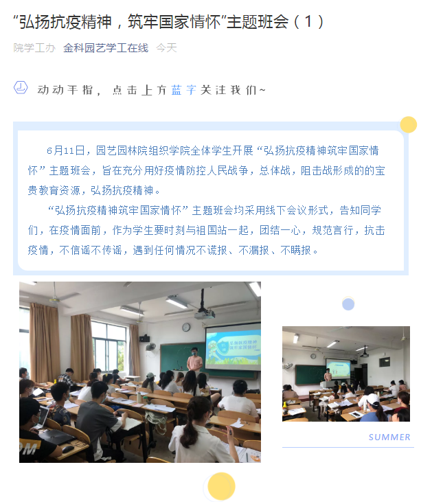 为充分用好疫情防控人民战争、总体战、阻击战形成的宝贵教育资源,弘扬抗疫精神,推动生命安全教育,增强学生家国情怀和民族自豪感,引导同学坚定“四个自信”,激发同学爱党爱社会主义的热情,园艺园林学院各班在6月通过线上、线下的方式开展了“弘扬抗疫精神,筑牢国家情怀”主题班会。
