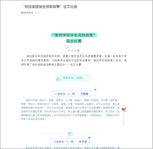 组织开展诚信系列主题活动。我院举办了线上资助诚信征文比赛,各班同学积极参加,共计收到59篇资助诚信征文作品。同时,举办了学生资助政策宣传画设计大赛,收到11张制作精美的宣传画册作品。本次活动还通过微信平台、QQ平台推送资助诚信知识,宣传国家资助政策设计的理念与初衷。