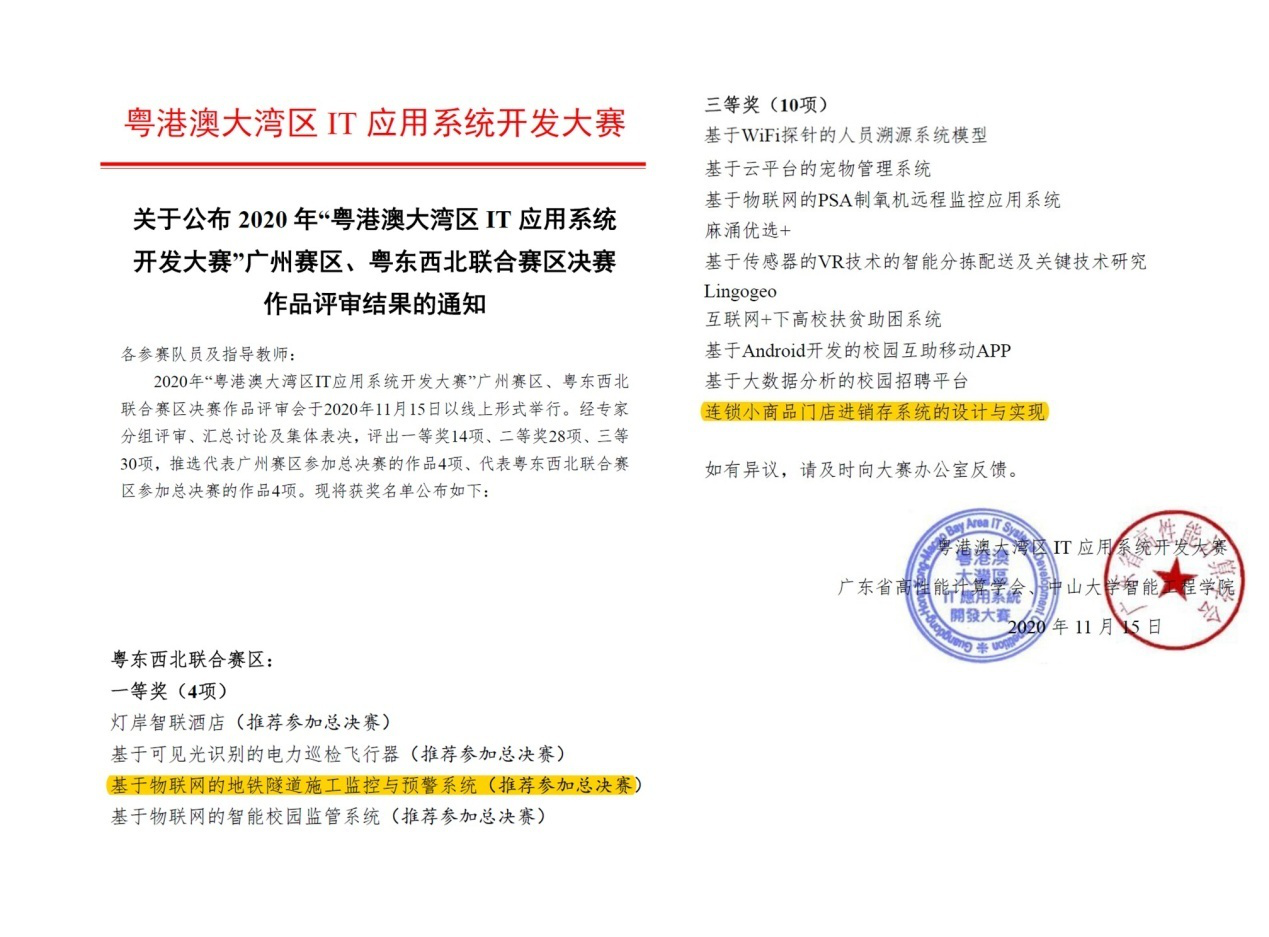 近期,国教院学生在全国“粤港澳大湾区IT应用系统开发大赛”的城市决赛中斩获1个一等奖和1个三等奖!获奖学生来自中英通信工程项目2019级班,他们组成了2个参赛队“荆轲”和“E-Life”。在网通学院孟超副教授和国教院张敏老师的指导下,“荆轲”队凭借“基于物联网的地铁隧道施工监控与预警系统”斩获粤东西北联合赛区一等奖,并被推荐参加总决赛;“E-Life”队的作品“连锁小商品门店进销存系统的设计与实现”也获得了粤东西北联合赛区三等奖。