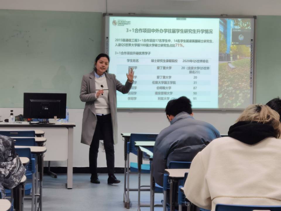 2020年12月16日下午,国际教育学院邀请英国德蒙福特大学(简称DMU)中国办公室季晓莉老师,在3号科技楼506教室为G18通信工程班就出国留学方面的问题进行讲座。讲座全程对家长进行线上直播。