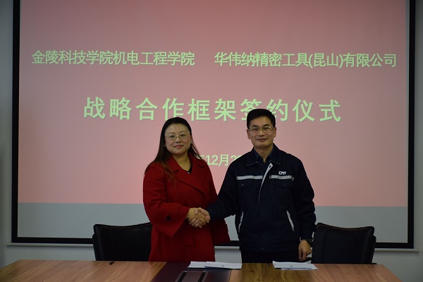 12月23日,机电工程学院与华伟纳精密工具(昆山)有限公司在昆山华伟纳公司签订校企合作协议,就人才培养、基地建设、实习就业等领域开展全面合作。华伟纳精密工具(昆山)有限公司总经理周艳君、人事行政部经理朱娟、机电工程学院党委副书记张蓉、机械工程系李晓晖、茅军等出席签订仪式。