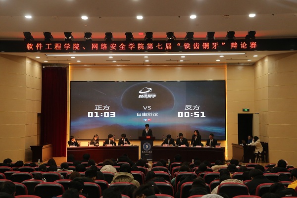 为了丰富同学们的课外活动,培养大家的思辨能力和语言表达能力,12月30日软件工程学院、网络安全学院于科技楼报告厅举办第七届“铁齿铜牙”辩论赛决赛,辅导员孙垒,杜文娟,院辩论社社长陈震,校辩论队领队刘定龙和近200名学生参加本次活动。