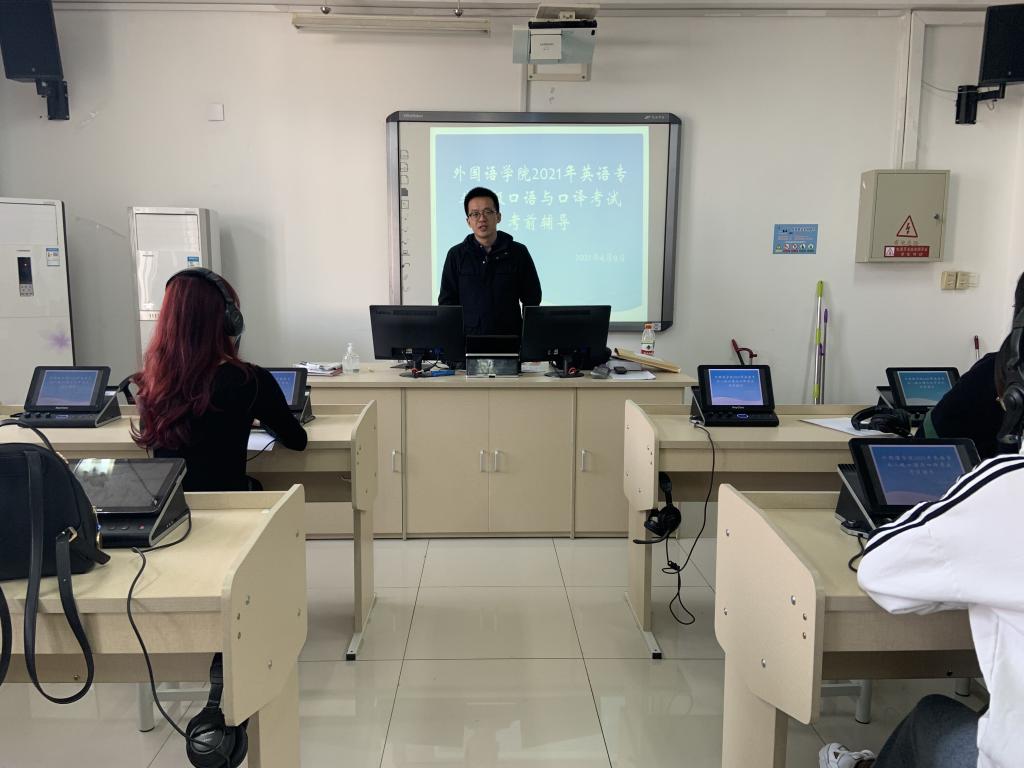 4月9日下午,外国语学院在8301教室召开了2021年英语专业八级口语和口译考试考前辅导会。本次辅导会由英语系副主任王喆主持,章倜老师、骆怡然老师全程参与。