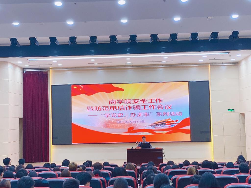 5月12日晚6:30,商学院在科技楼1号楼报告厅召开“学党史,办实事”系列活动之安全工作暨防范电信诈骗工作会议,学院党委副书记孙亮、部分辅导员、各班班长、团支书、生活委员、心理委员等学生干部近260人参加了此次会议。