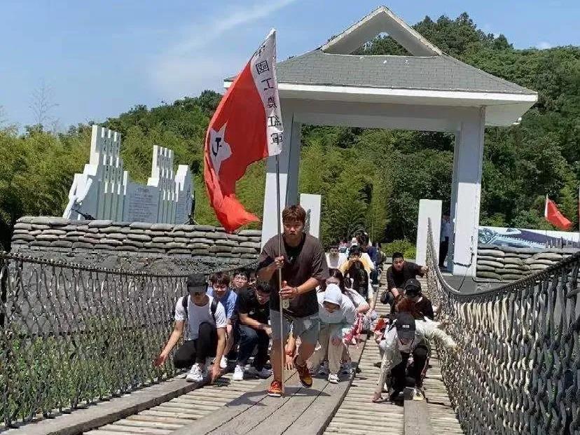 炎炎烈日下,学生们成四列纵队在长征广场集合。广场以红军长征的出发地瑞金为素材,建有瑞金牌楼,上面的“中华苏维埃临时共和国”字样和党徽等都是按照原样复制而建。学生们面向瑞金牌楼紧握拳头,庄严承诺学习红军战士的不屈意志和坚定信念,保证完成长征之旅。在教官和讲解员的引导下,在“枪林弹雨,炮火轰鸣”和后有追兵的紧迫感中学生们沉浸式地经历了湘江战役、遵义会议、四渡赤水、飞夺泸定桥、娄山关大捷、爬雪山、过草地,沿着红一方面军的长征路线到达三军胜利会师广场。在2.5公里的“长征路”研学之旅中,重温长征精神,感悟“革命理想高于天、流血流汗不流泪、掉皮掉肉不掉队”的理想信念。