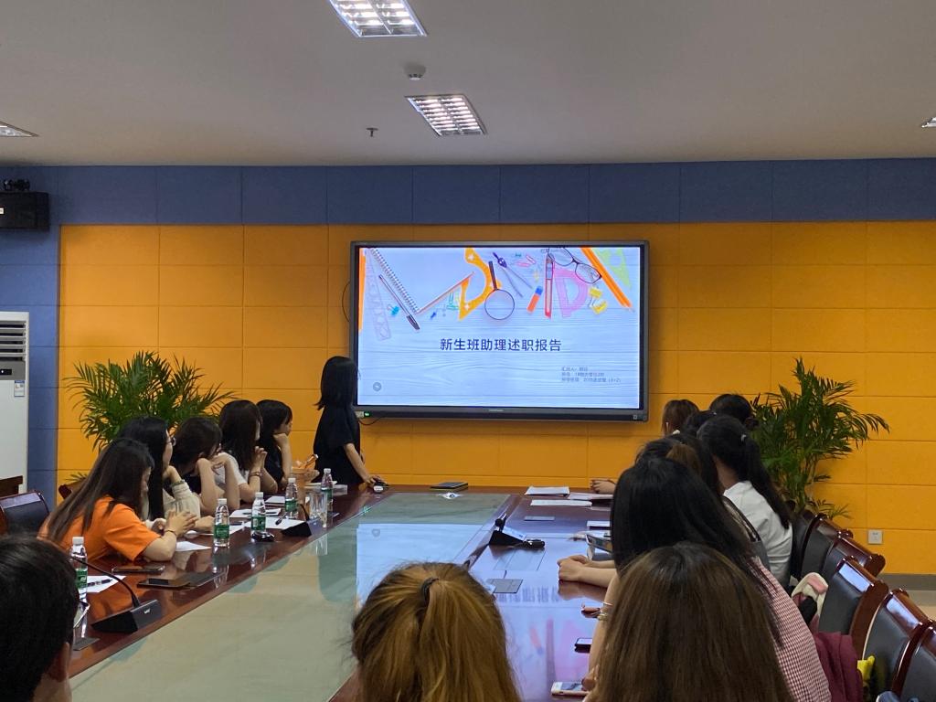 会上,新生班辅导员助理们依次上台进行述职报告,他们结合自己所带班级特点和自身工作经历,介绍了迎新报到、军训期间陪同、协助班主任组织开展班级集体活动、建设班级学风考风等工作的具体落实情况,分享个人在任务安排和分配中遇到的困难和解决的方法、措施,以及对一年来工作存在的不足之处的深刻反思。辅导员助理们通过精美的PPT、真情实感的演讲赢得了在场所有人的阵阵掌声。虽然每人只有短短2分钟述职时间,但他们溢于言表的情感让我们感受到他们一年来工作的收获,更展现出了商科学子认真负责的工作态度和积极向上的精神面貌。最后,辅导员老师们给新生班辅导员助理评分,并结合所带班级表现、学生民主测评、个人述职等因素进行综合考核。