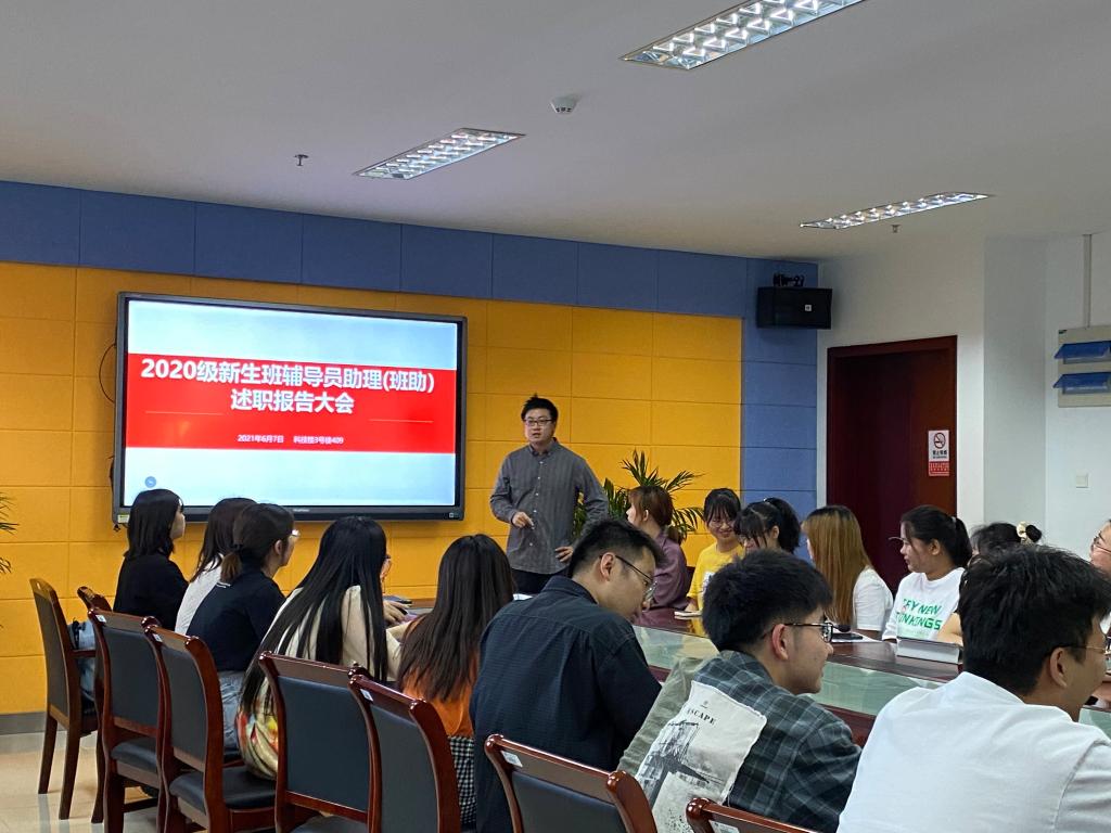 为了正确评价新生班辅导员助理的工作能力,督促辅导员助理不断提高业务素质,认真履行岗位职责,商学院于6月7日18:30在科技楼3号楼409会议室开展2020级新生班辅导员助理考核工作暨述职大会,院学工办副主任徐冰洁、院学工办全体辅导员、全体2020级新生班辅导员助理以及学生代表共同参与活动,会议由辅导员李竹叶主持。