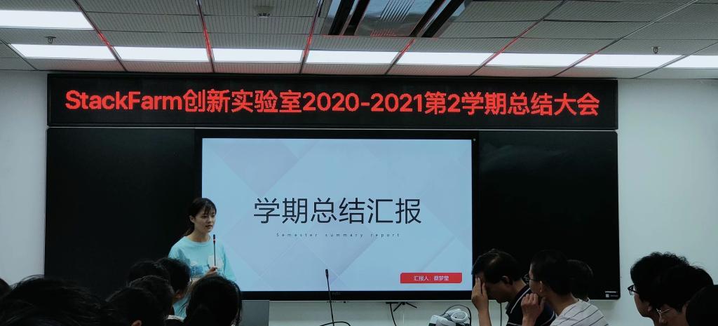 本次总结大会主要分为五项议程,第一项议程:实验室各年级成员分别汇报了本学期各自的学习成果,总结了本学年的收获。并罗列出自己的暑期学习计划。第二项议程是欢迎20级新进成员,新成员的自我介绍向学院展现出StackFarm创新实验室生生不息的活力与满怀朝气的创造力。第三项议程:为表示对StackFarm创新实验室这一学年成果的肯定,徐书记和吴老师给予了StackFarm创新实验室鼓励与赞扬,同时也提出更高的期望与要求,希望StackFarm创新实验室在接下来的发展中,再创辉煌,更进一步。