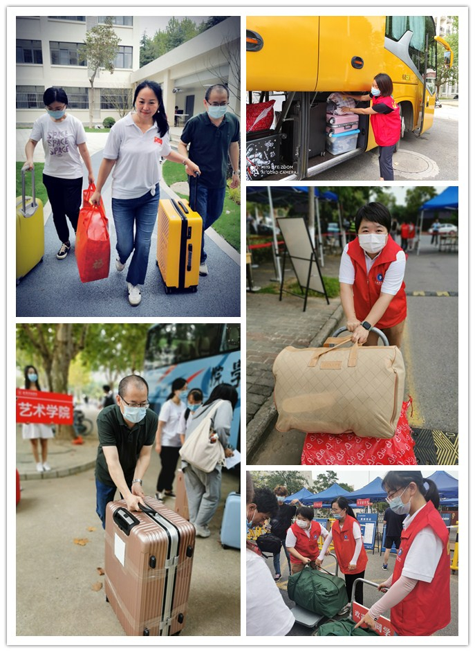 在宿舍区,外院教师志愿者们也在热火朝天的帮助新生将行李运送到宿舍,忙碌的身影频繁穿梭在宿舍楼内。刘状吉老师看到学生就第一时间接过她们手里的行李,边说着:“同学,我来我来,你别动。”晏文梅老师一心想着减轻学生的负担,让新生尽快安顿好宿舍,双手扛着一件件大件的行李爬着楼,丝毫没有叫苦叫累。田丽娟老师始终带着满面笑容,乐呵呵接过新生手里的行囊,温暖的形象瞬间拉近了老师们与新同学之间的距离。