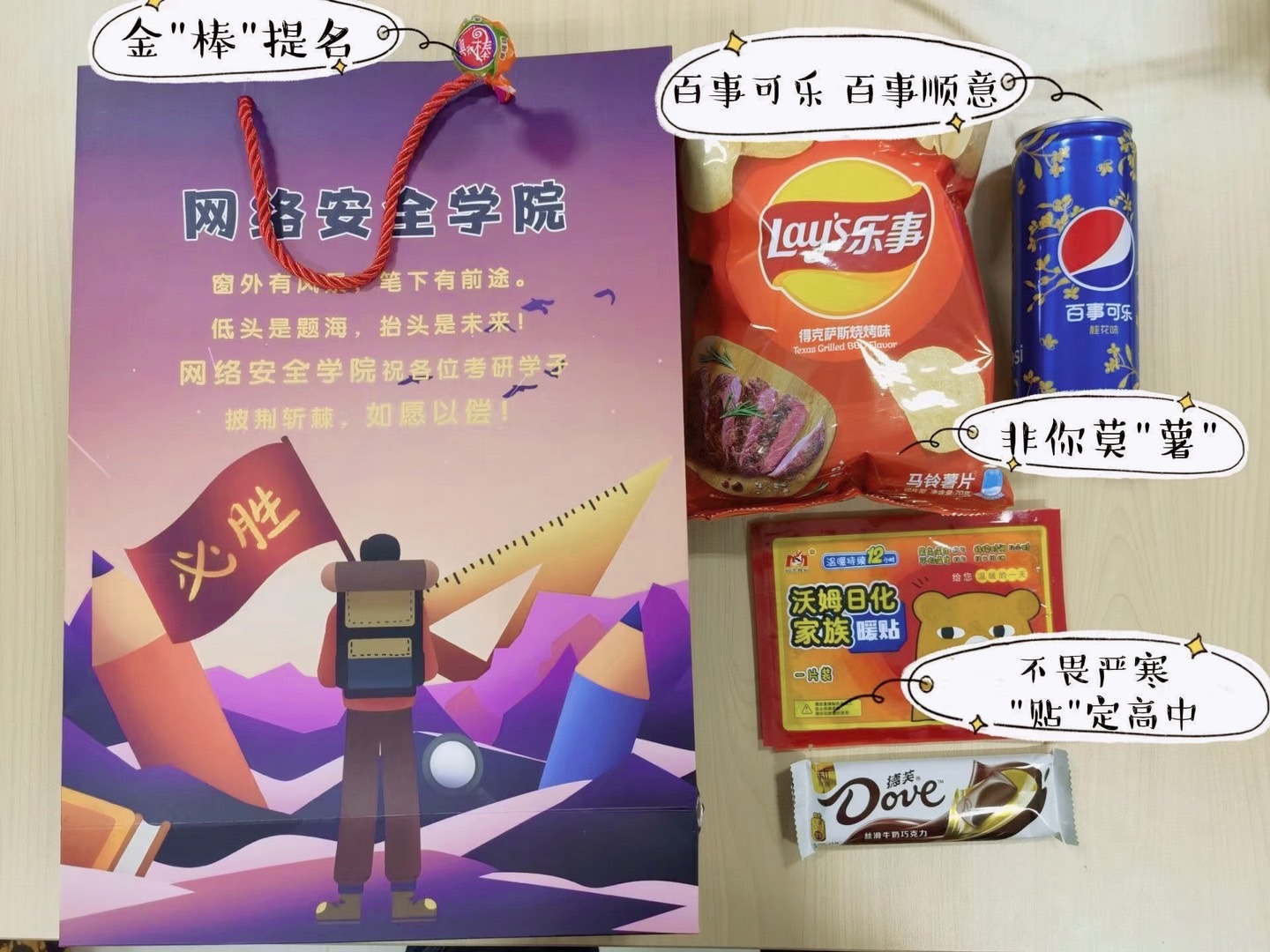 毕业班辅导员孙垒老师详细了解了考研学生的备考情况,对同学们勤奋复习的状态给予了肯定和赞扬,激励大家充分利用好最后的冲刺时间,以优异的成绩实现自己的理想。最后,辅导员们代表学院将精心准备的慰问礼包发放到每一位考研学子的手中,让学生真切感受到网络安全学院大家庭的温暖。同学们纷纷表示,会耐得住寂寞,扛得住压力,不断超越自我,用最好的状态迎接考试,以最优异的成绩回报学院的培养和关怀。(审稿人:马晓辉)