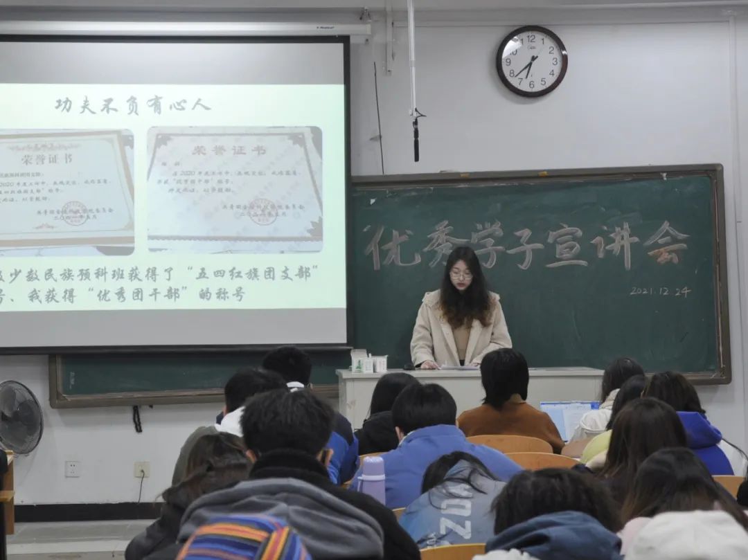 本次宣讲会的主题为“写民族长歌,谱青春华章”。四位宣讲人来自我院不同专业的优秀学子,第一位宣讲人来自21汉语国际教育班刘若冰同学,她从自身经历出发,鼓励大家在课余多参加校园活动充实提升自己。第二位宣讲人是来自19秘书学1班刘思娴同学,作为国家励志奖学金获得者,她主动跨学科建立项目小组,并在合作专业老师的支持下参与2021年全国大学生创新创业挑战赛,取得省级项目立项,她为学弟学妹们提出了学习和实践建议,不断挑战自己。来自20行政管理班的宣讲人才骐榕同学,担任班干部期间,她培养了创新思维、科学决策能力、组织管理能力,鼓励大家多多锻炼。最后一位宣讲人梅嫄同学来自21古典文献学(古籍修复)班,她作为21少数民族预科班辅导员助理,她从学习、实践和工作等方面将经验传授给新生们,带领学弟学妹们将“红石榴”大家庭建设的越来越好。活动最后,高欢欢老师强调要珍惜光阴,好好学习,积极参加实践活动,锻炼自己的能力,融入人文大家庭,在金科遇见更好的自己!