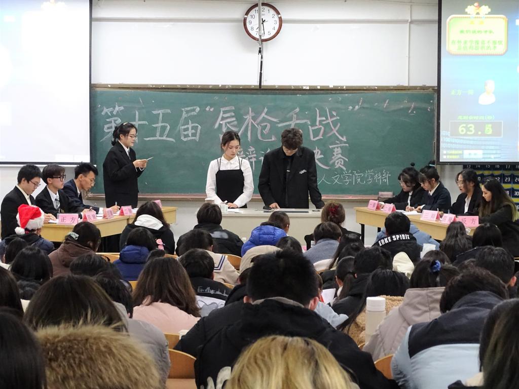 辩论赛是语言的校量,更是思维的碰撞。12月24日,在图教楼B405人文学院举办了第十五届“唇枪舌战”辩论赛的决赛,担任本次决赛的评委有辅导员梅冬琴老师、人文学院院学生会执行主席王碧粟和历届三位辩论队优秀辩手。