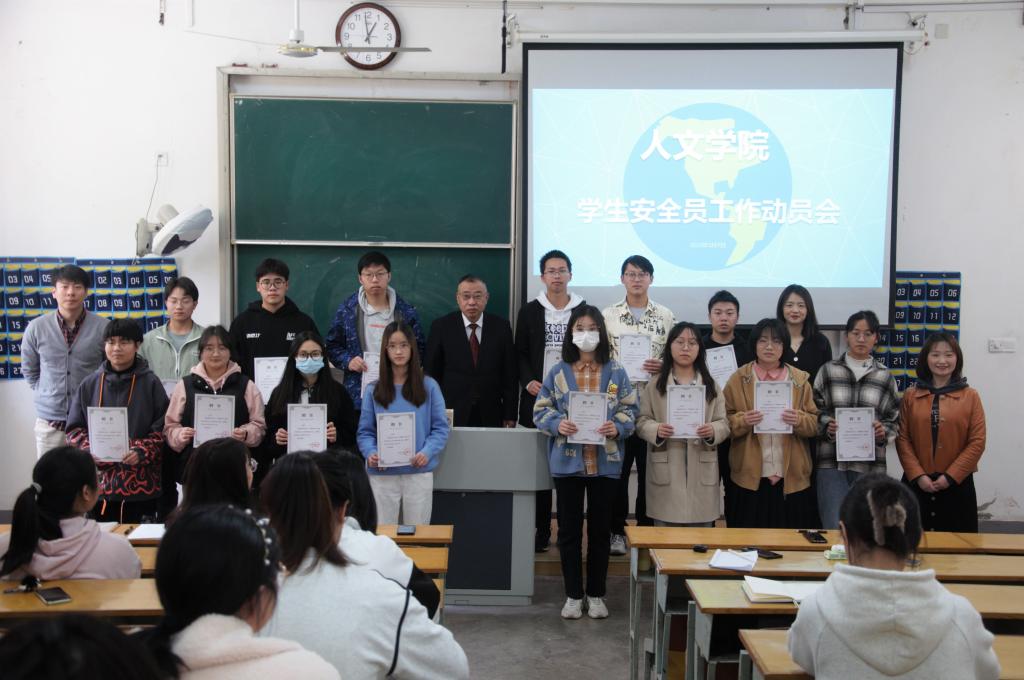 为响应学校关于防范电信诈骗工作要求,积极落实人文学院学生安全工作, 3月9日12:30,在教学楼二阶教室人文学院召开了学生安全员工作动员大会。学院党委书记吴轶军、副书记韩铖、学工办主任童明明、辅导员马思齐出席了大会。全院各班级安全员参加了大会。会议由马思齐老师主持。
