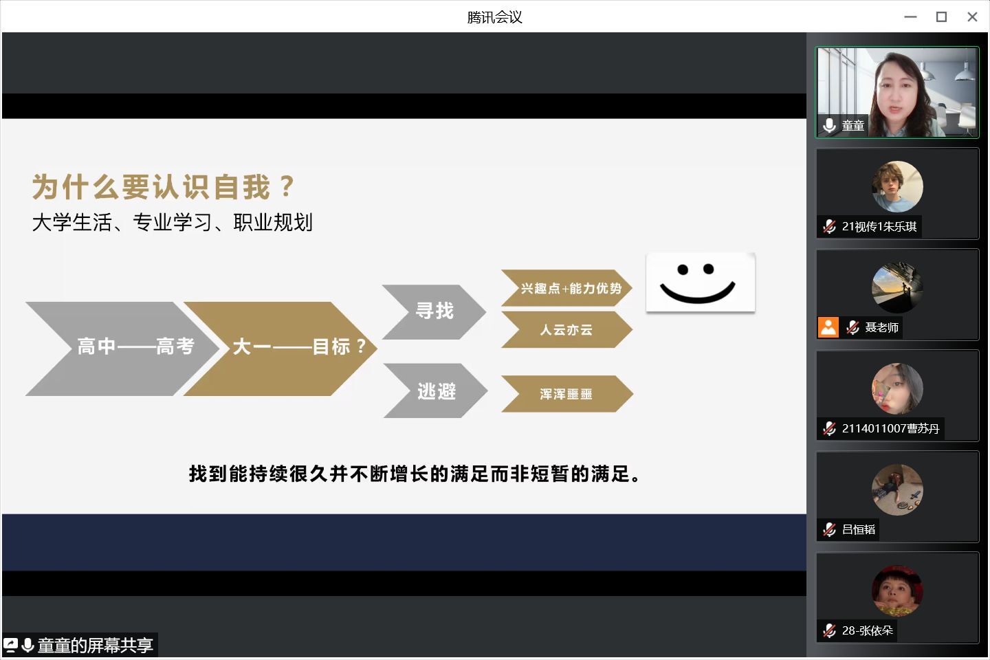 童艳副教授以“认识自我”为主题,和同学们一起讨论了大学生活、专业学习、职业规划等三方面内容。针对“大学生活”,童艳老师向大家介绍了为什么要认识自我、如何认识自我,她表示,同学们要将自身的兴趣点与能力优势相结合,这样能够更好地规划专业学习和职业生涯。在“专业学习”上,她表示软件学习并非最为重要的内容,相较而言,专业兴趣、美术技能和基础课程才是艺术类的同学们更需要去夯实的重要基础。在“职业规划”方面,童艳老师结合身边的实际例子,与大家分享了两个关键词,即“追求梦想”与“扬长避短”,她建议同学们要寻找梦想与现实的平衡点,结合实际条件去抉择,在追求梦想的同时更要抓紧当下的学习。