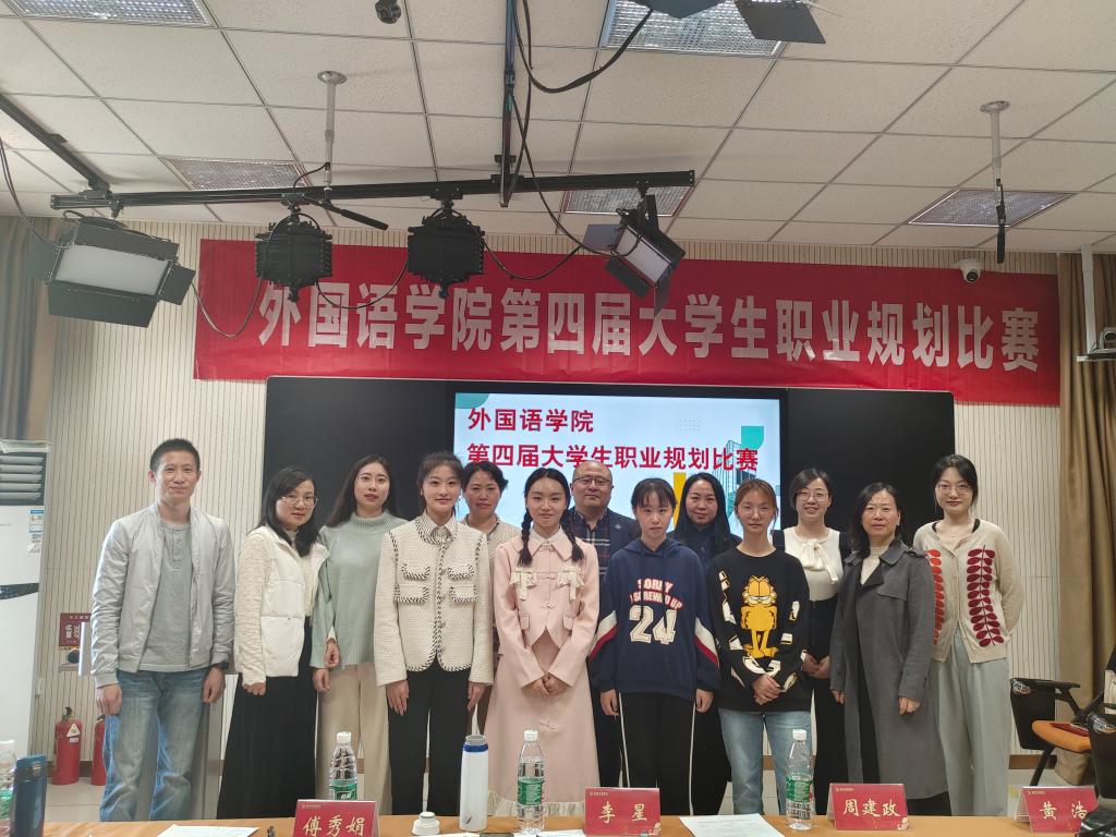 为普及生涯规划知识,传播生涯成长理念,提升学生的实践能力和就业能力,10月12日下午,外国语学院在8305教室举办了一场以“生涯逐梦,职赢未来”为主题的大学生职业规划比赛。本次比赛邀请了江苏领航集团校园事业部总经理、职业生涯认证规划师周建政,外国语学院党总支部书记李星,学工办主任王奕,团总支部书记杨婷,以及外国语学院黄浩、傅秀娟、宗小琦、耿小龙等四位老师担任评委。外国语学院2021级、2022级约50名学生到场观摩比赛。