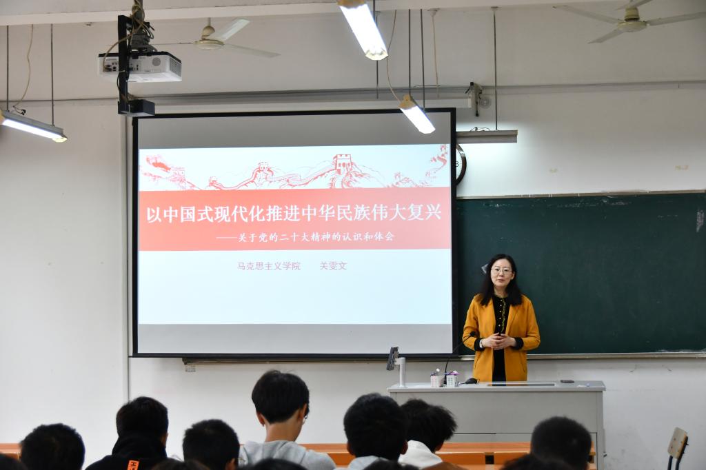 第二场讲座“以中国式现代化推进中华民族伟大复兴”为主题,本次讲座邀请马克思主义学院关雯文老师作为主讲人在本次讲座中,关老师从四个方面对此次主题进行了讲解。一是介绍了开辟马克思主义中国化时代化新境界,关老师指出,推进马克思主义现代化就必须坚持“两个结合”,坚持人民至上、自信自立、守正创新、问题导向、系统理念、胸怀天下。二是新时代阶段中国共产党的中心任务。关老师特别强调了坚持中国式现代化要统筹发展,全面高质量发展。同时提出了二十大的一个亮点:党代会报告第一次单独成章对教育、科技、人才工作进行一体部署。三是从构建新发展格局,推动经济高质量发展角度来说,如今高质量发展从“有没有”转向“好不好”,同时高质量发展不仅仅是经济的高质量发展,更是全面的高质量发展。四是要在团结奋斗中实现全体人民共同富裕。