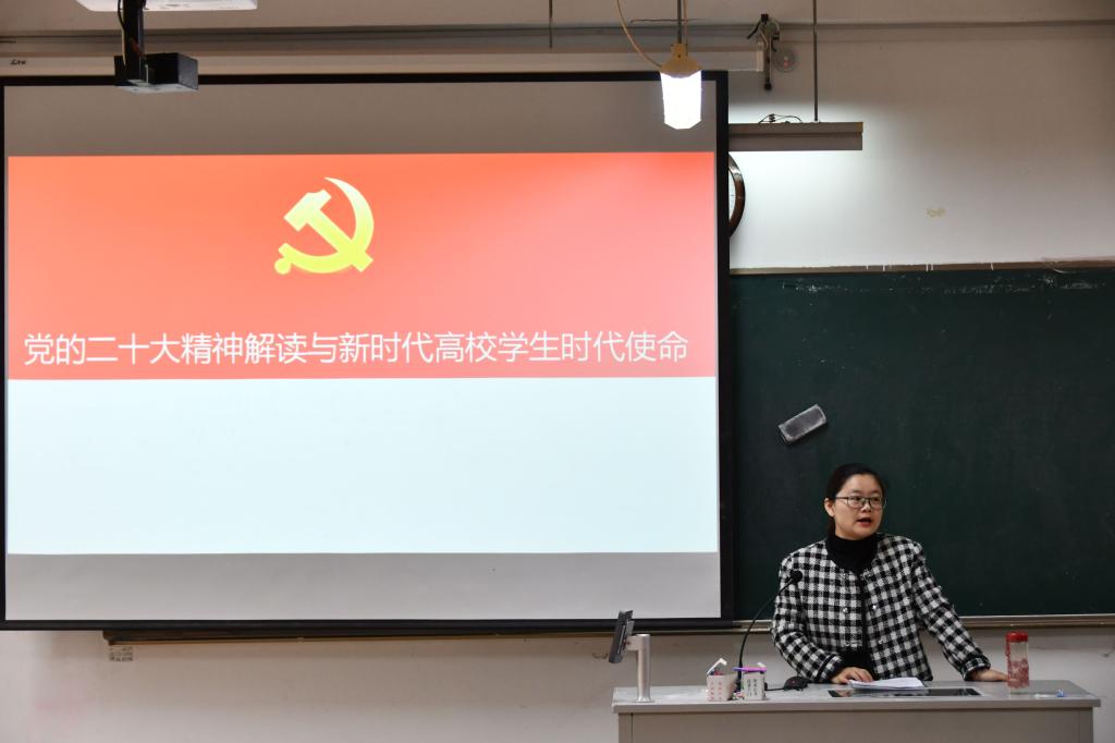 第一场讲座由马克思主义学院吴小倩老师主讲。吴老师以党的二十大精神解读与新时代高校学生时代使命”为主题带领我们深刻认识了党的二十大的意义吴老师向我们详细讲述了党的二十大报告中的关键论述,对习近平总书记重要讲话和二十大精神理论创新进行了阐述,宣扬了新时代中国特色社会主义取得的重大成就和宝贵经验。最后吴老师对新时代高校学生提出要求,希望新时代高校学生能够担当起时代的使命。