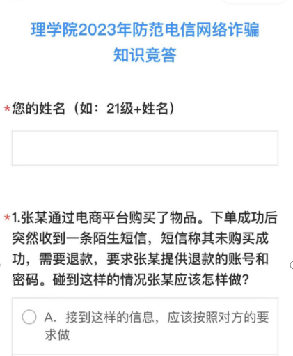 为将“安全”体现在学院的各个角落,做到居安思危,以小见大,为理学院全面开展春季“防范电信网络诈骗主题宣传教育月”工作夯实基础,3月14日-20日,学院特开展防范电信网络诈骗知识竞赛答题活动。案例是最生动的教材,活动以电诈案例为主题,通过案例分析提醒同学们要树立安全意识,注重信息安全,做好自我防护。