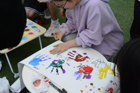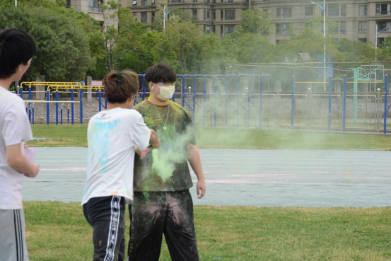 在本次活动中,同学们穿上有自己亲手绘制图案的白色t恤,手持彩色玉米粉包,在比赛开始信号发出后,一面奔跑,一面将玉米粉喷洒在周围好友的身上。清风徐徐,阳光不盛,同学们迎风向前,互相追赶嬉戏,友情于此刻悄然升温。2-3圈的肆意畅快追逐后,每位参赛者都“焕然一新”,欢声笑语中身上满是各种色彩。经过短暂休息,进入小游戏环节。不论是“绕口令”、“手印涂鸦”,还是“吹爆气球”、“口是心非”,学生们过五关、斩六将,最终获得通关凭证,兑换成精美奖品。带着各自赢得的战利品,和一头五彩的颜色,参赛者们结伴而行回到宿舍。