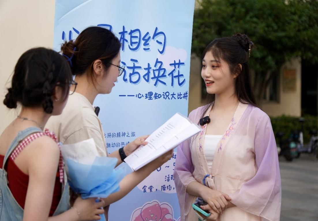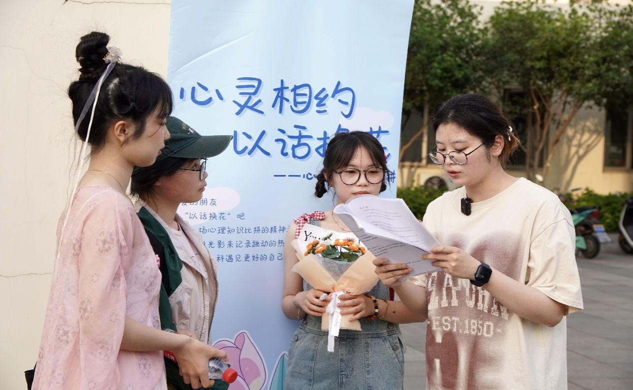 区别于传统的知识比拼活动,“心灵相约·以话换花”心理知识大比拼采用校园内面对面提问的趣味方式,通过在校园内随机采访的形式邀请同学回答心理类问题,以此普及心理知识。镜头下同学们沟通互动,主动表达爱与感恩,吸引了约百名同学参加。