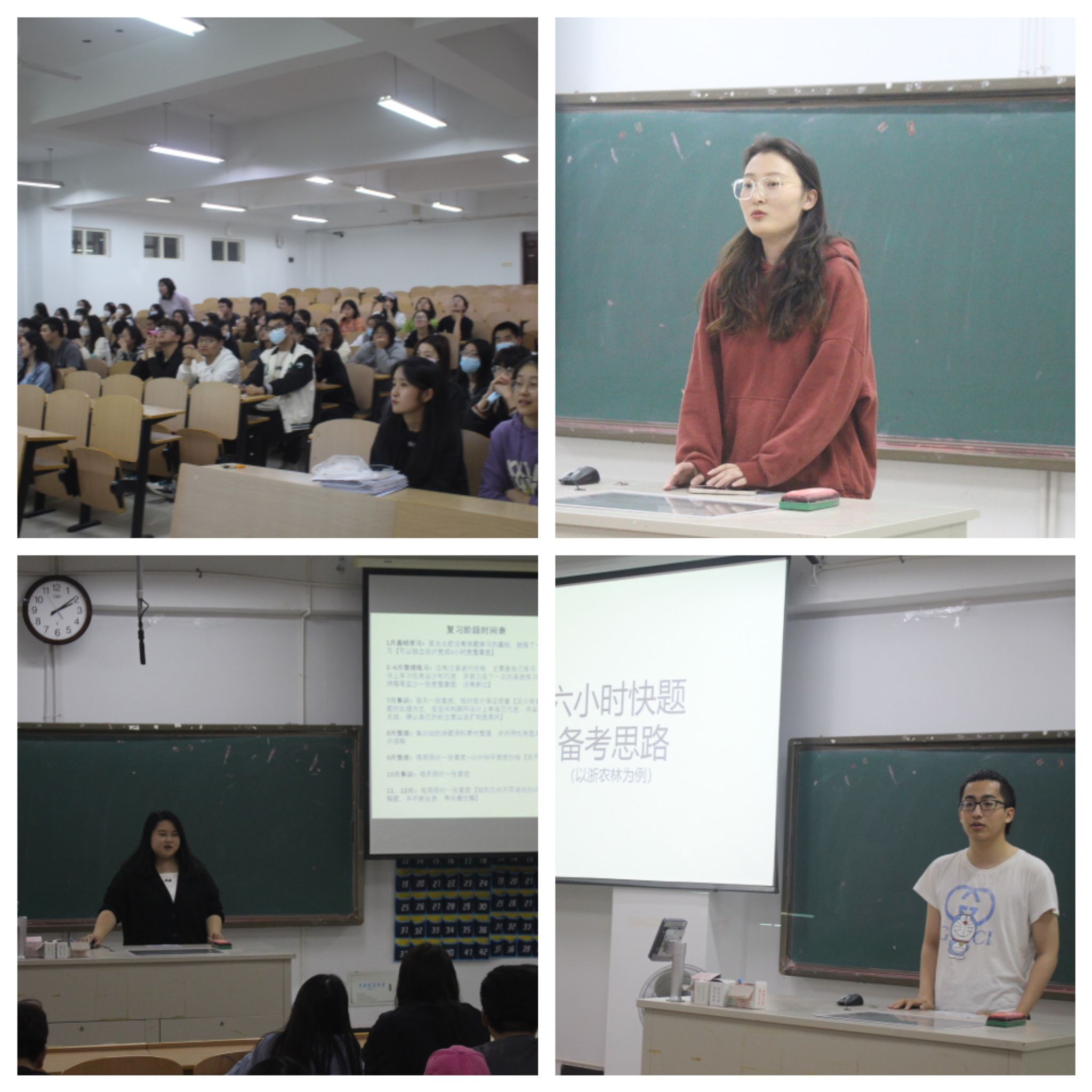 主讲人引一句“满船清梦压星河,偷捧时间煮酒喝”规聚学习方法;借一句“天生我材必有用,千金散尽还复来”明确考研目标;述一句“路漫漫其修远兮,吾将上下而求索”点亮计划制定;19级学生再结合精心准备的PPT为择校经验、资料准备、考研时间安排以及考试过程中的注意事项等方面的问题进行了详细的解释。最后张胜男老师对同学们的发言进行了总结,欲上研岸,须做出正确的选择,在此选择上付出十足的努力;欲上研岸,须提前收集信息,做好充足的准备,打造一个最适合自己的考研方法;欲上研岸,须守得住初心,耐得住寂寞。(通讯员:张胜男)